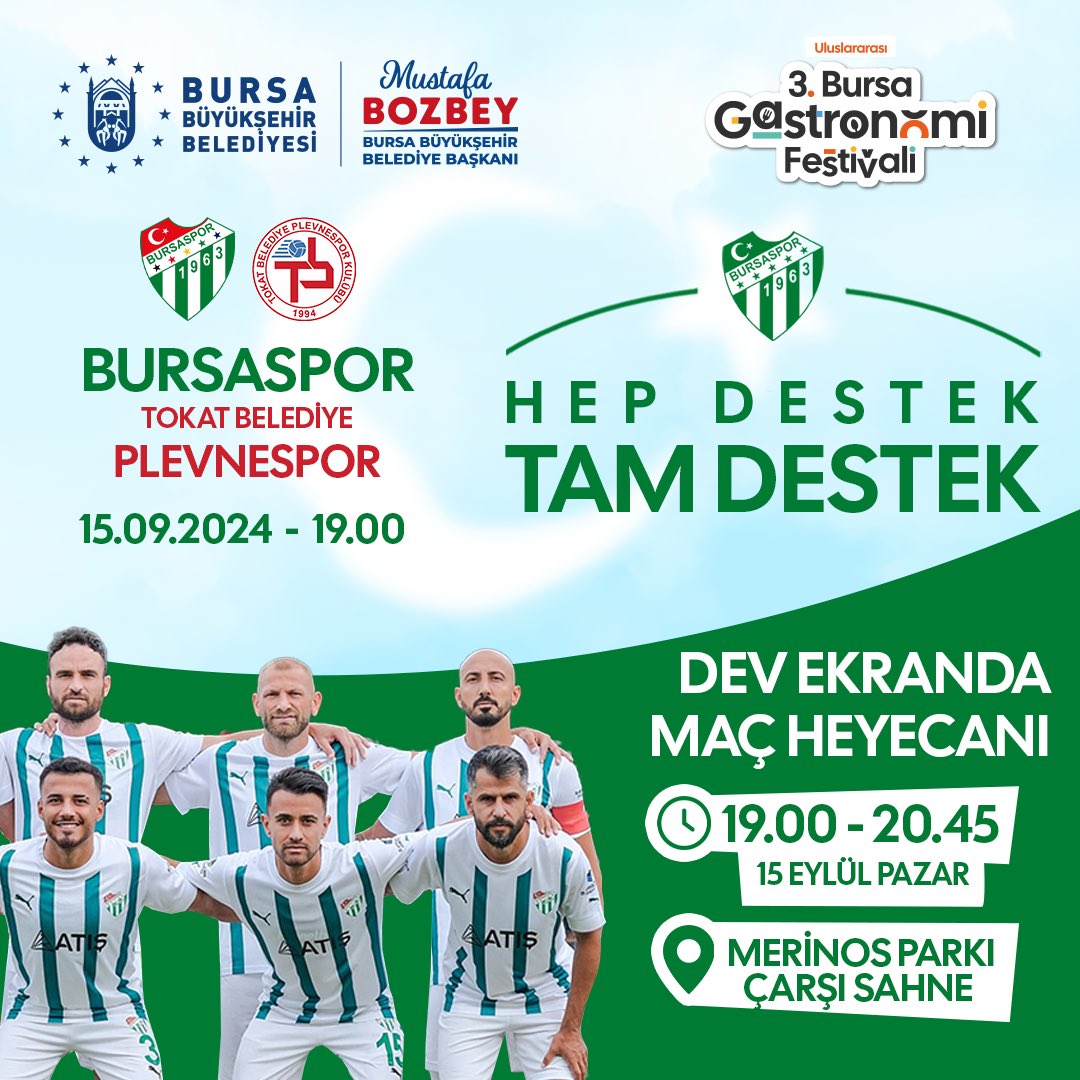 Bursaspor, Tokat Belediye Plevnespor ile karşı karşıya geliyor. Bu önemli futbol maçı için taraftarlar, destek vermek amacıyla dev ekran başında buluşacak. Heyecanın dorukta olacağı etkinlik, 15 Eylül 2024 Pazar günü saat 19.00'da gerçekleştirilecek. Tüm futbolseverler, Bursaspor'un yanında olmak için Merinos Parkı Çarşı Sahne'nde bir araya gelecek. Bu buluşma, takıma olan bağlılığı göstermek ve maçı birlikte izlemek için harika bir fırsat sunuyor.