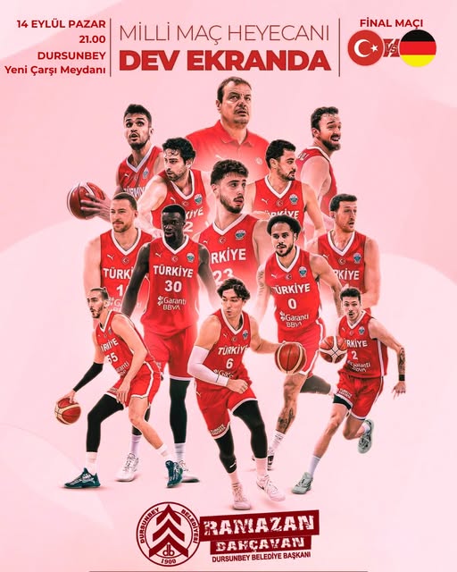 Dursunbey Belediyesi, 12DevAdam Avrupa Basketbol Şampiyonası Finali'nde Türkiye'nin Almanya ile gerçekleştireceği tarihi karşılaşmayı ilçe halkıyla birlikte izlemek için özel bir organizasyon düzenliyor. 14 Eylül Pazar günü saat 21:00'de Çarşı Meydanı'na kurulacak dev ekranda milli takımın mücadelesi canlı yayınlanacak.